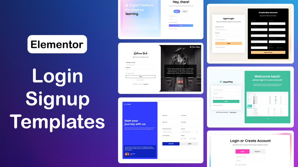 Beautifully designed login and signup page templates for Elementor page builder. Download and extract "login-signup-templates-pack.zip" after purchase and follow the instructions in the tutorials folder.